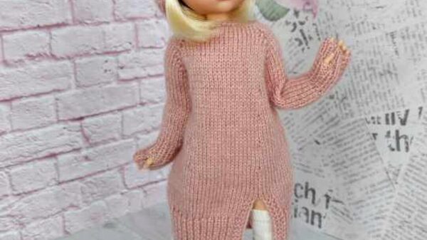 По этому описанию вы сможете связать распашное платьице для куклы с застежкой на пуговицы на спинке. Платье вяжется безотрывно от начала до конца, на двух спицах поворотными рядами. Платье вяжется на спицах №1.5-1.7 + крючок (для сшивания рукава) Пряжа: Alize «Angora Gold» (100 г 550 м) или