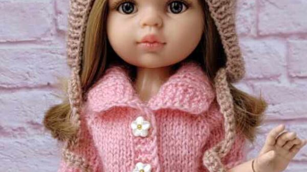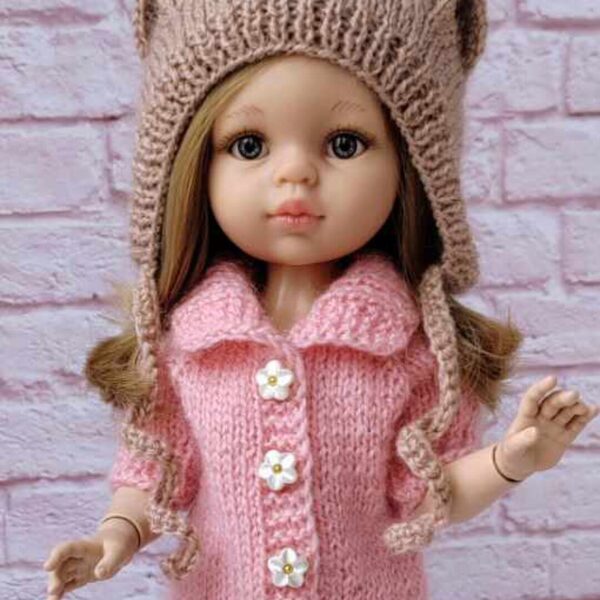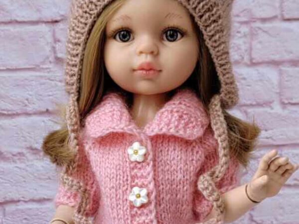 о этому описанию вы сможете связать комплект для куклы Паола Рейна ростом 32-34 см (или аналогичной по телосложению), состоящий из платья с разрезом и котошапочки бини без завязок. Платье с застёжкой на пуговицы на спинке вяжется вкруговую на пяти спицах. Рукав сшивается крючком. Шапочка вяжется на
