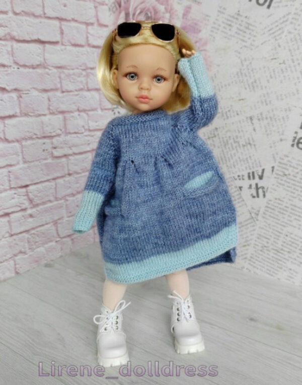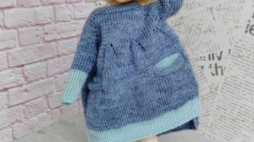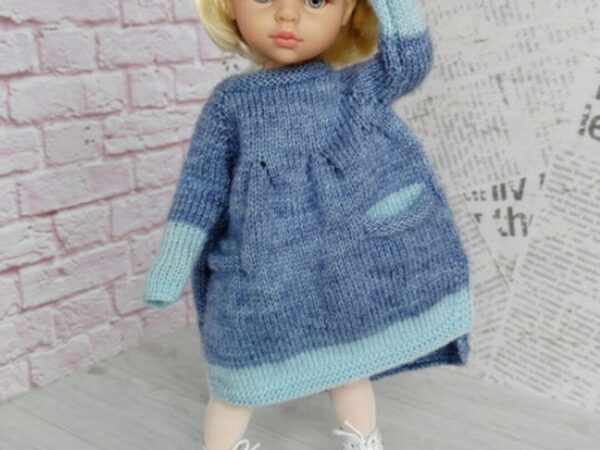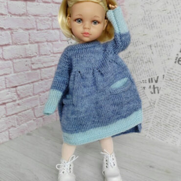 Описание вязания платьица для куколок 21 см серии miniamigas Paola Reina спицами. Полностью распашное платьице-бочонок с кармашками и застежкой на пуговицы вяжется без отрыва нити на двух спицах №1.5 (1.2). Плотность вязания: Полотно 15п+2кр= 4см в ширину. МК в PDF файле на 5 страницах включает в