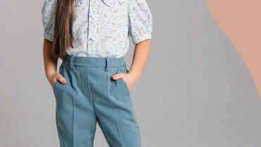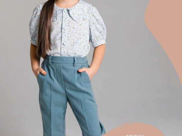 На Кристине брюки в размере 110, скорректированные по росту до 116.