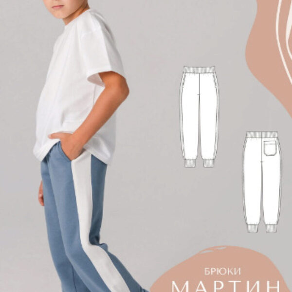 Курс Modety - Брюки Мартин. Размер 92-158, автор Лия Хорькова. Брюки умеренного объёма, на притачном поясе. Верхний край пояса находится на естественной линии талии. В пояс вставлена эластичная лента. Вдоль боковых швов расположены лампасы, которые можно выполнить из контрастного материала. На передних половинках карманы в боковых швах. На задней правой половинке брюк - накладной карман. Низ брюк оформлен притачной манжетой. Пояс и манжеты выполнены из кашкорсе. Длина брюк до щиколоток.