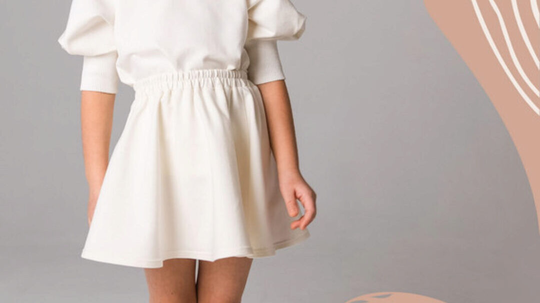 Юбка полусолнце на притачном поясе на резинке. Верхний край пояса располагается на естественной линии талии. По поясу проложена фиксирующая отделочная строчка. Длина юбки выше колен.