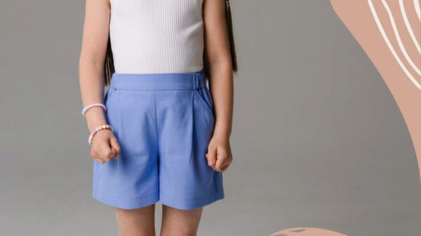 Платье детское свободного силуэта, с завышенной линией талии. Вырез горловины округлый, обработан обтачкой. Линия плеча спущена. Рукав втачной, объемный, длиной ниже локтя. По окату рукава сборка, по низу рукава кулиска с резинкой. Юбка платья состоит из двух ярусов, которые собраны на сборку. На