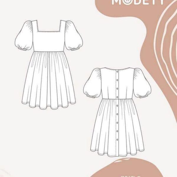 Платье детское отрезное по линии талии. Лиф платья малого объема, юбка большого объема. Линия талии завышена. Вырез горловины по переду «каре», по спинке- округлой формы. На спинке талиевые вытачки и застежка-планка на петли и пуговицы. Плечо укорочено. Рукава объемные, втачные, со сборкой по окату, длиной выше локтя. По низу рукава вставлена эластичная тесьма для сборки. Юбка коническая, объемная, с густой сборкой по талии. Длина платья выше колен. Срез горловины обработан обтачкой.