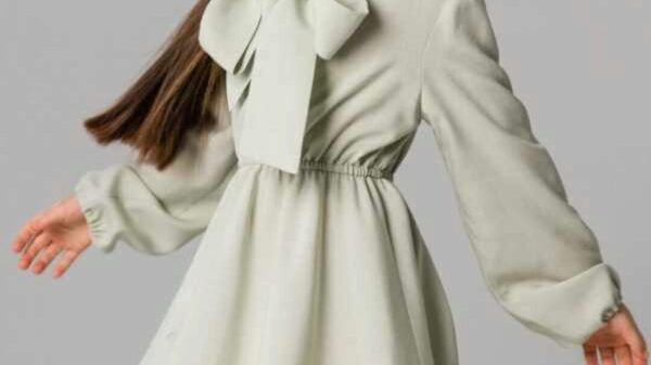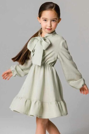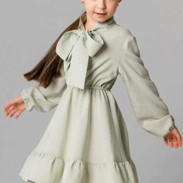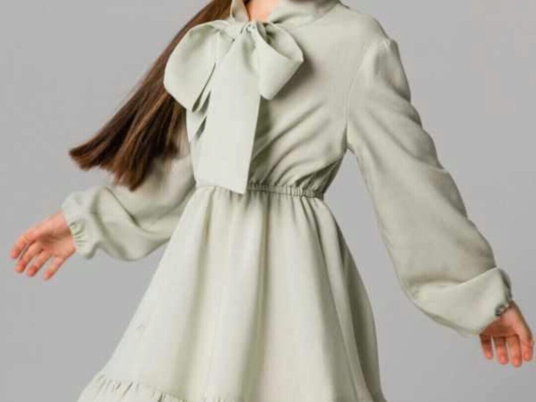 Курс MoDety - Платье Келли. Размеры 122-158, автор Лия Хорькова. Платье отрезное по талии, умеренного объема, Х-образного силуэта. По талии платье собрано на эластичную тесьму-резинку. Линия талии слегка завышена. Горловина переда с разрезом. Воротник-стойка переходит в завязки банта. По спинке воротник-стойка со средним швом. Рукав втачной, длинный, со сборкой в верхней части оката рукава. Низ рукава собран на эластичную тесьму-резинку. Юбка платья конической формы. По низу платье оформлено оборкой. Длина платья до колен.