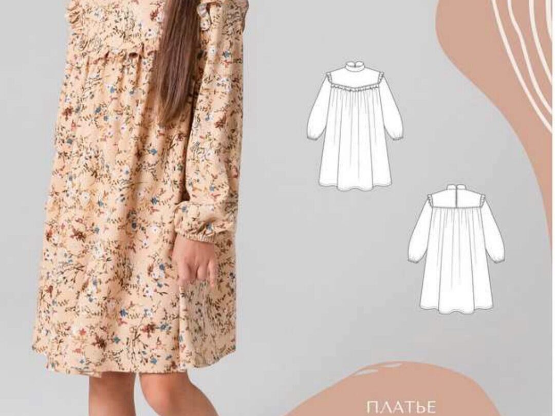 Платье свободного объёма, силуэта трапеция. На переде фигурная кокетка, оформленная оборкой. На спинке кокетка, разрез, застежка на навесную петлю с пуговицей. Под кокеткой спереди и сзади сборка. Воротник стойка. Рукав втачной, длинный. Низ рукав со сборкой, собран на эластичную тесьму-резинку. Верхняя часть оката рукава декорирована оборкой. Длина платья ниже колен.
