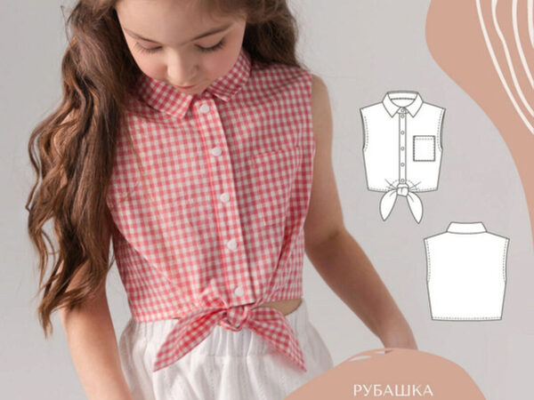 Рубашка умеренного объема, прямого силуэта, без рукавов. С левой стороны переда - накладной карман. По низу переда оформлены завязки. Воротник рубашечный, отложной на отрезной стойке. Застежка - планка центральная на кнопки. Проймы рубашки обработаны бейками. Длина изделия чуть ниже талии.