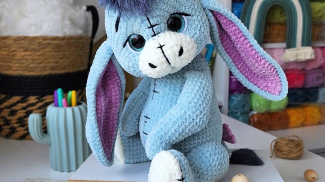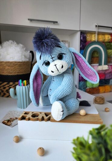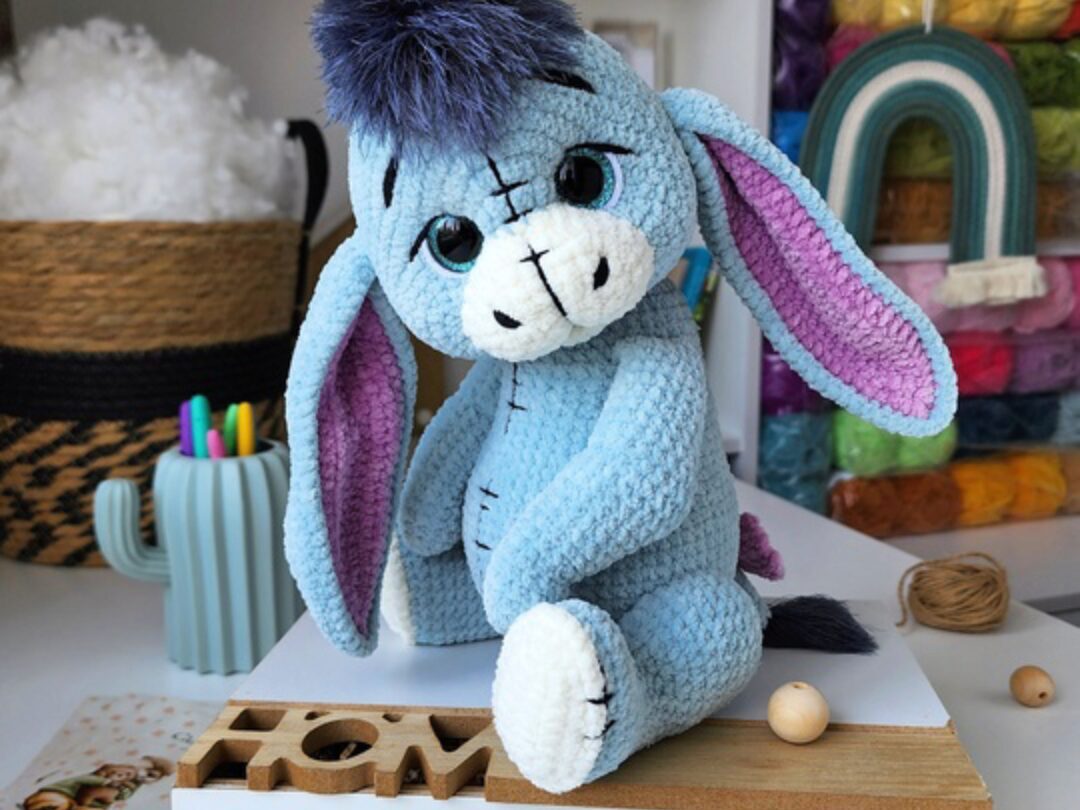 Ослик вяжется из стандартной плюшевой пряжи 100гр/120м. Ноги и руки ввязываются в тело, голова на шплинтовом креплении. Ростом игрушка получается примерно 33-34 см.
