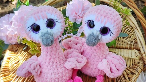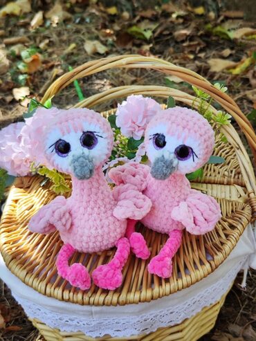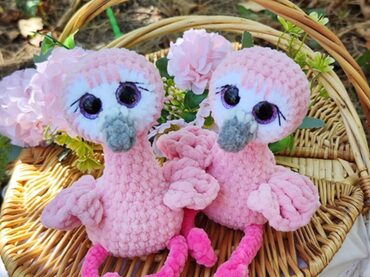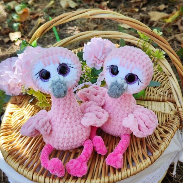 Фламинго вяжется одной деталью снизу вверх. Сначала вяжется тело, потом голова, тело ввязывается в голову по ходу вязания. Крылья и хвост надвязываются поверх готовой игрушки. Пришивается только клюв.