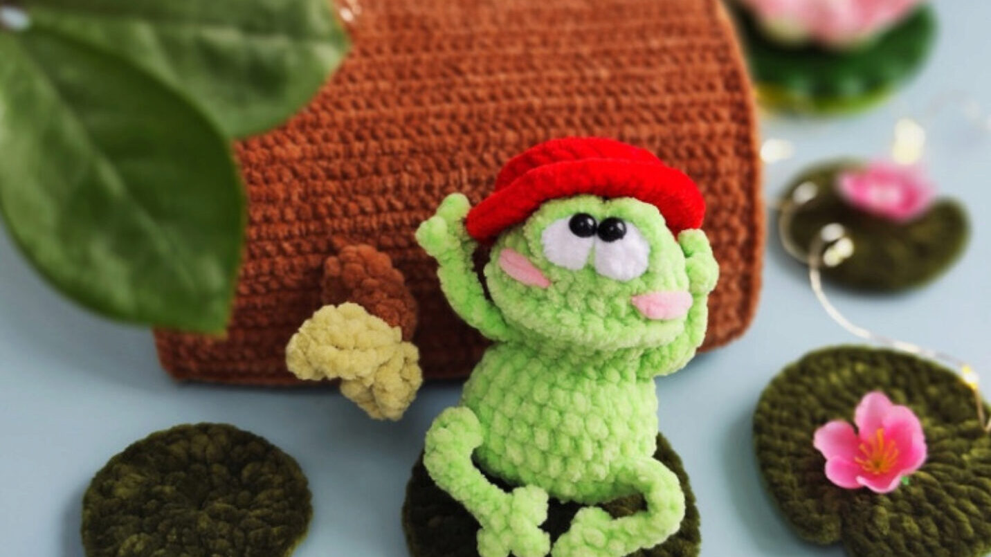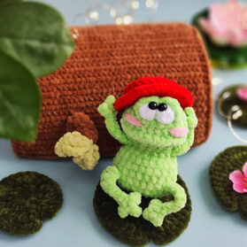Шляпка тоже входит в МК. Размер лягушонка в сидячем виде 10см, в зависимости от пряжи, номера крючка и плотности вязания.