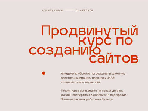 Начало курса — 3 февраля За 3 недели вы научитесь самостоятельно разрабатывать аккуратные и полезные сайты, лендинги, интернет-магазины. • Уже после первой недели разберетесь с платформой и сможете сделать лендинг и технические настройки. • На второй научитесь делать сложные сайты. • После третьей