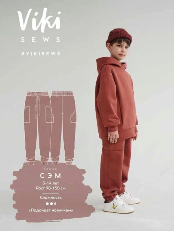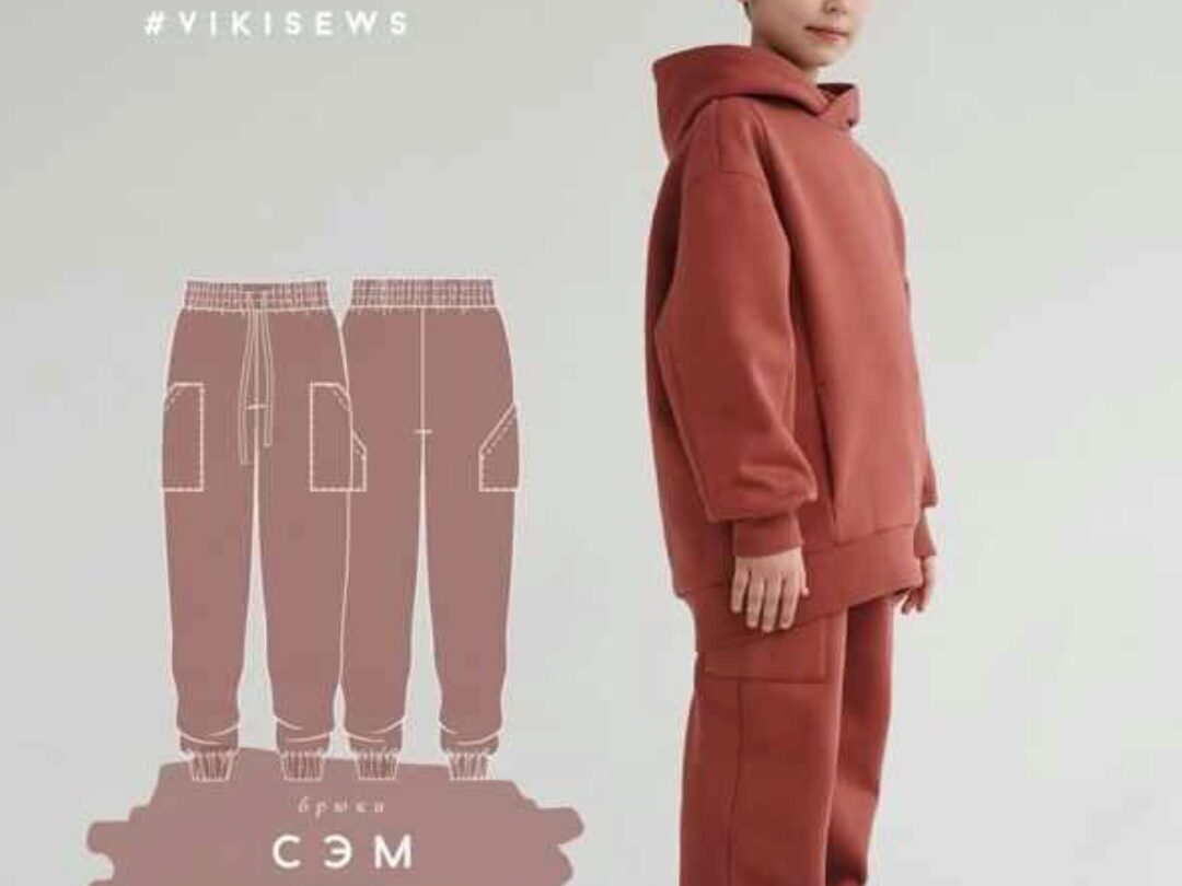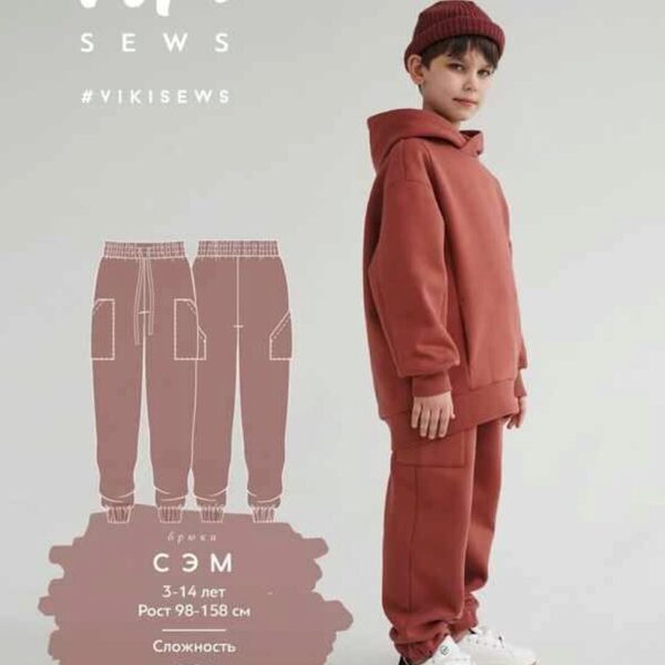 Курс VikiSews - Брюки Сэм (мальчики). Размер 28, рост 110, автор Вика Ракуса. Выкройка брюк прямого силуэта, большого объема. Верхний край притачного пояса находится на естественной линии талии. В пояс вставлена эластичная тесьма(резинка), проложены два ряда отделочных строчек, образующие кулиску. Через обметанные прорезные петли в кулиску продета киперная лента. Брюки имеют две пары карманов – боковые в швах и накладные на уровне колен. Накладные карманы прямоугольной формы, со скошенной линией входа в карман. Длина до щиколоток, в припуск на обработку низа вставлена эластичная тесьма(резинка).
