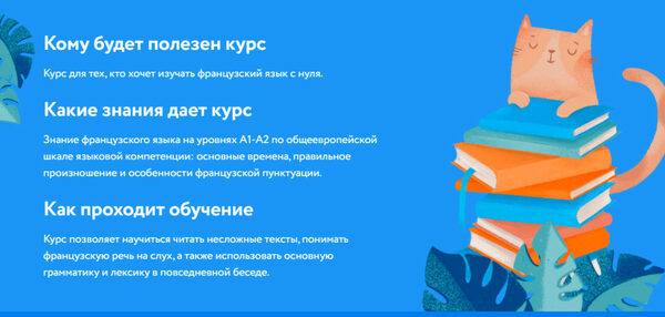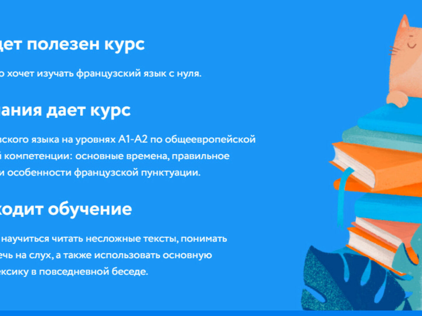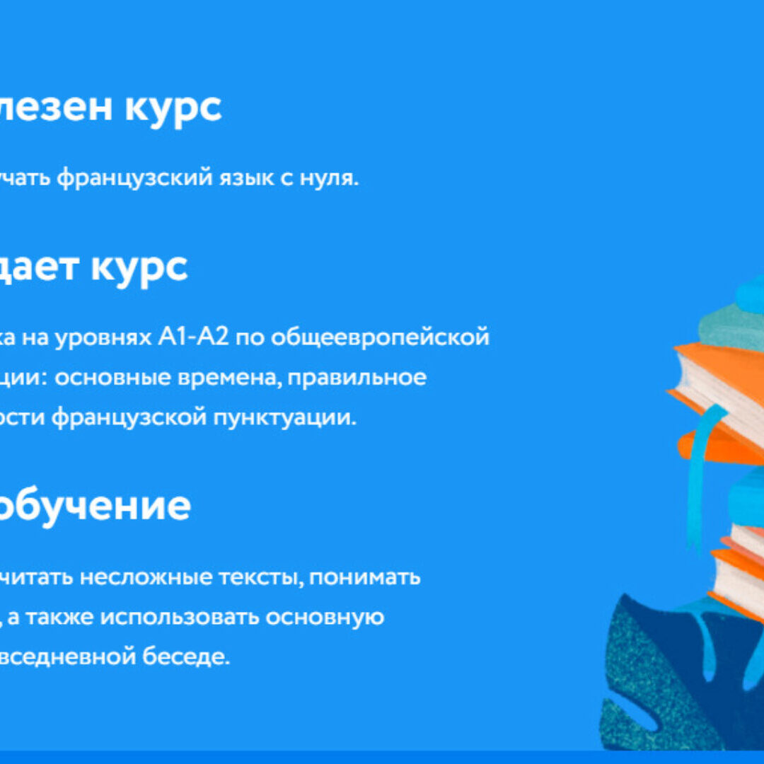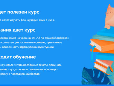 Курс позволяет научиться читать несложные тексты, понимать французскую речь на слух, а также использовать основную грамматику и лексику в повседневной беседе.