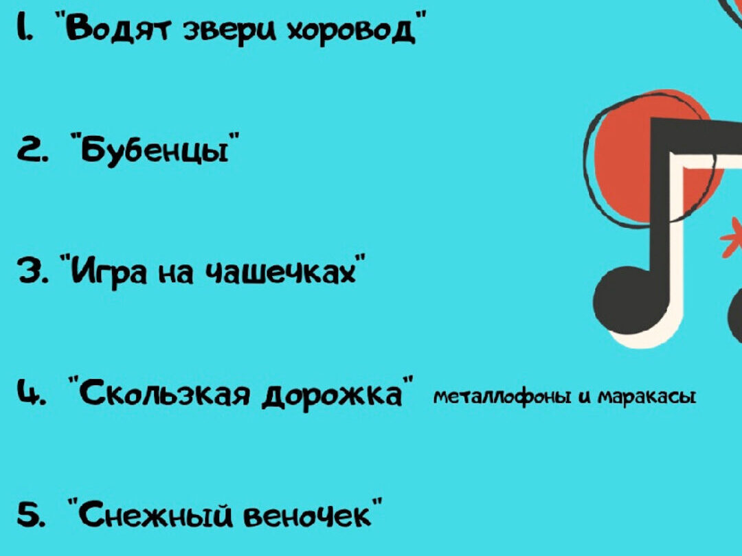 В альбом вошли: 1. Звенящая забава (муз игра) 2. Мы - оркестр (игра на муз инстр) 3. Танцующие платки (муз игра) 4. Времена года (муз игра) 5. Козлятки и волки (регистры) 6. Шагаем, спим, танцуем (жанры) 7 . Что за гость! (муз ритм игра) 8. Дружба (песня) 9. Жёлтая история (СКАЗКА) 10. Песенка
