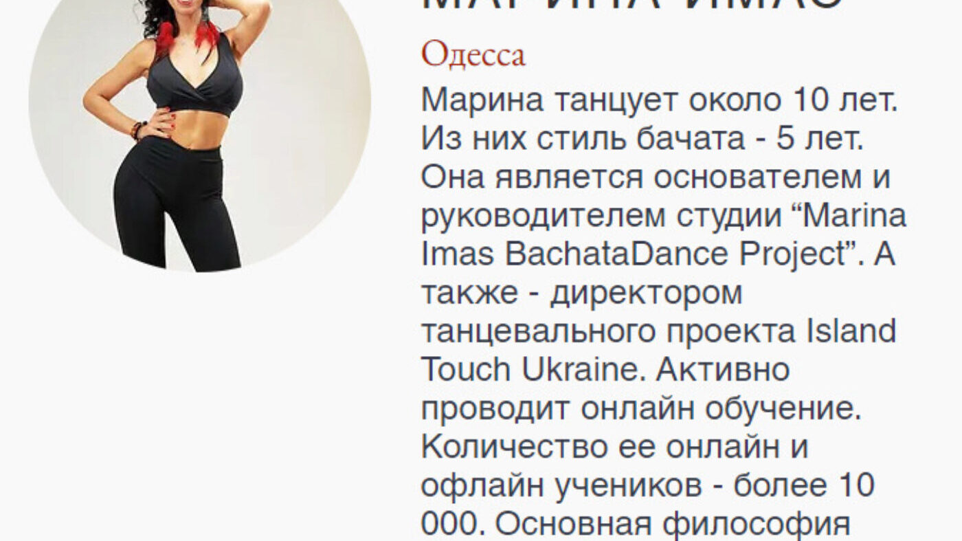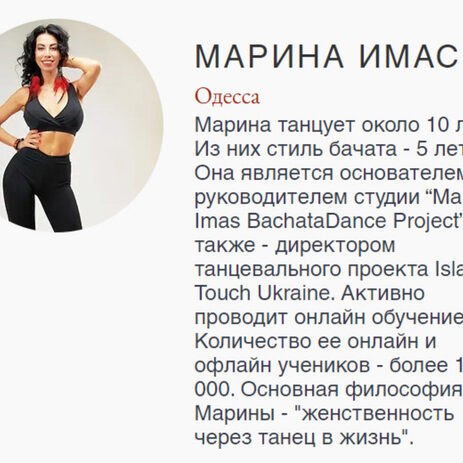 Марафон «Женственность через танец» О авторе: Я, Марина Имас. Мне 44 года. Танцую 11 лет. Обучила более 3000 учеников на онлайн и оффлайн занятиях. Поделюсь с вами не только всеми тонкостями Бачаты - танца, захватившего весь мир, но и опытом сохранения красоты и молодости на долгие годы. Почему