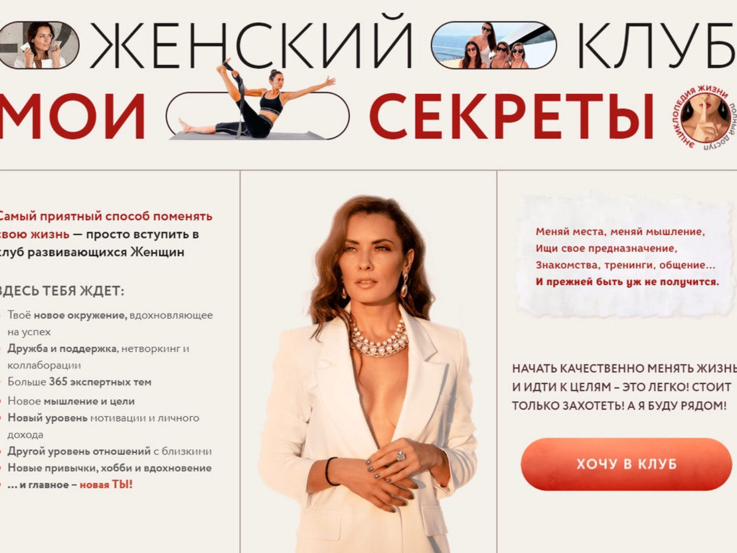 ЧТО ТАКОЕ ЗАКРЫТЫЙ КЛУБ? Это сообщество девушек, которые хотят достичь максимальных высот через возможности своего ума и тела. Бесконечный тренинг саморазвития, который мы создаём вместе. Каждый месяц мы выбираем определенную тему и прокачиваем её со всех сторон восприятия Теория. Живые лекции от
