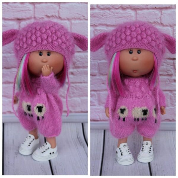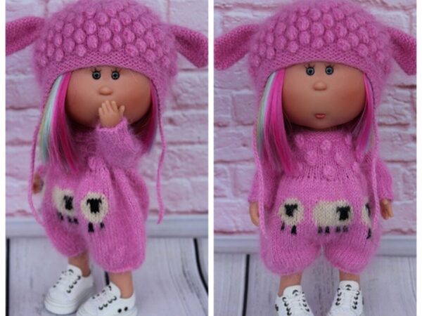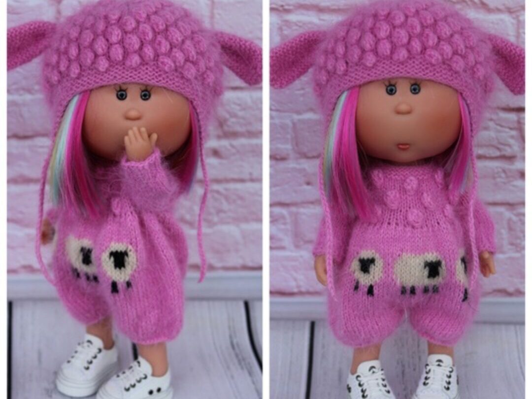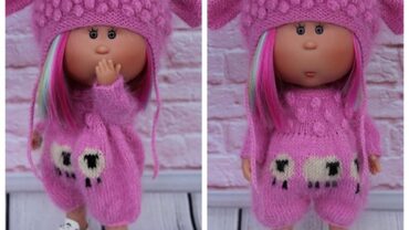 Комплект состоит из полукомбинезона с застежкой спереди на пуговках, украшенного декоративным «сердечком» из шишечек, из аккуратного, кругленького беретика, выполненного платочной вязкой, украшенного помпоном и пальтишка с переходами цвета, с воротником, связанного платочной вязкой. Нам