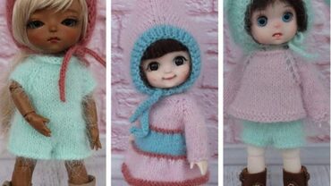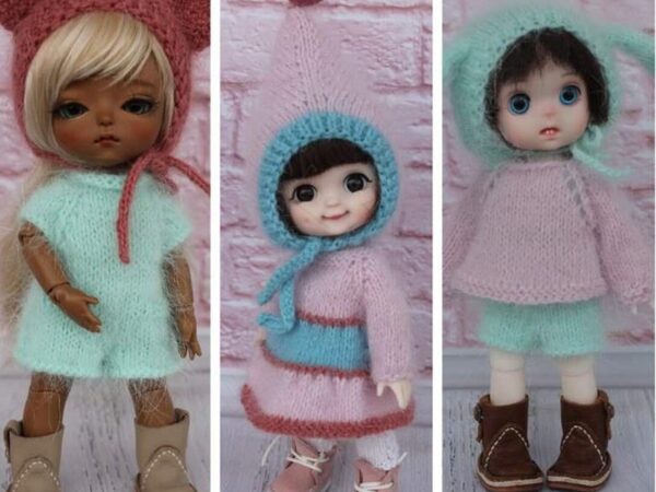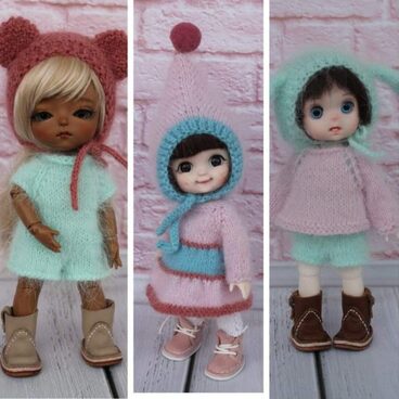 Второй комплект «Милый зайчик» состоит: из комбинезона на лямочках с короткими штанинками (сами понимаете, что длину штанин можно сделать по своему вкусу!), туничка распашная сзади и прибавками по бокам, за счет чего идет расширение и инетересная посадка на куколку, завершает комплект шапочка-чепчик с ушками зайки.