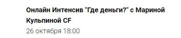 МАРАФОН «MONEY COME 2.0» 26 октября -1 ноября Деньги приходите! Деньги приходите! Деньги приходите! Уникальный денежный марафон с Мариной Кульпиной CF! Вы готовы к тотальному получению? На марафоне вы получите простые прагматичные инструменты для создания денег в вашей жизни! Что будет на марафоне