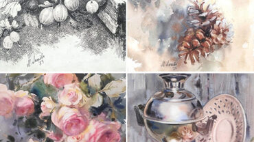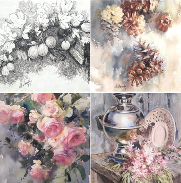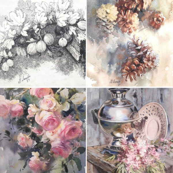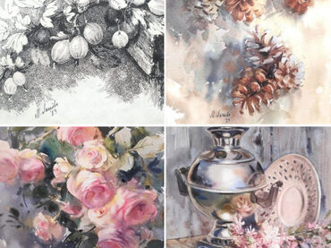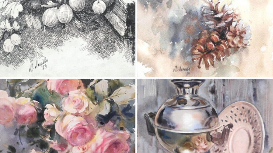 Собираем все знания вместе и закрепляем в натюрморте с дачными мотивами. Плюс передаем блестящую фактуру самовара и древесный узор на столе. Ищем гармонию в цветовом решении и комбинируем акварельные техники.