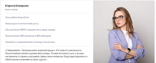 Вы получаете полный курс / тренинг со всеми материалами, но без обратной связи и поддержки автора Марины Макаровой — именно это позволяет предложить такую выгодную цену. Вы учитесь в удобном ритме, без переплаты за сопровождение.