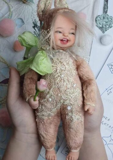 Рост 18 см без ушек. Отверстие для личика 4 см.