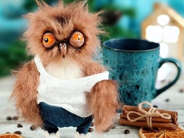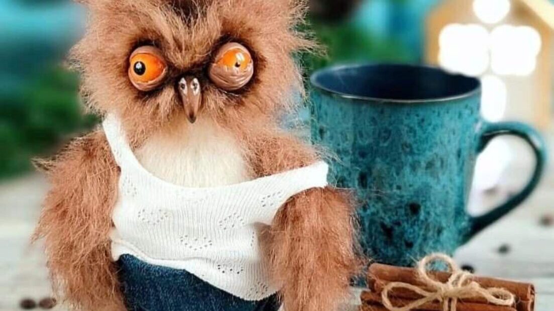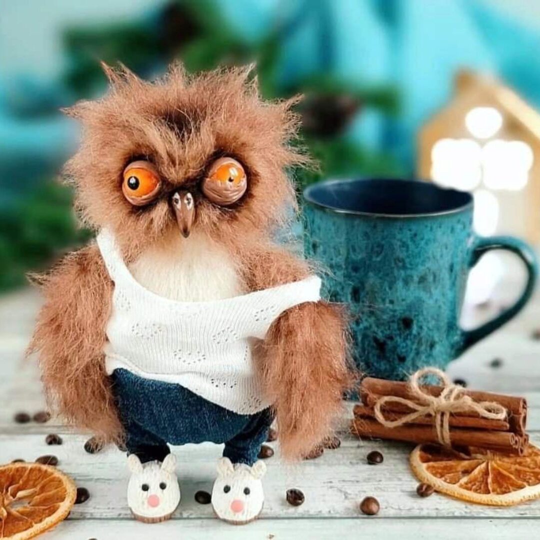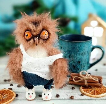 Каркасная игрушка в комбинированной технике из ангоры и мохера. Игрушка вяжется в 2 нити: ангора( Real 40/Angora Gold)+ Kid Royal- в тон основной нити. Для каркаса используется герберная(флористическая) проволока, диаметр 1,2-1,4 мм. Игрушка цельновязаная. Есть лепные детали из полимерной глины.