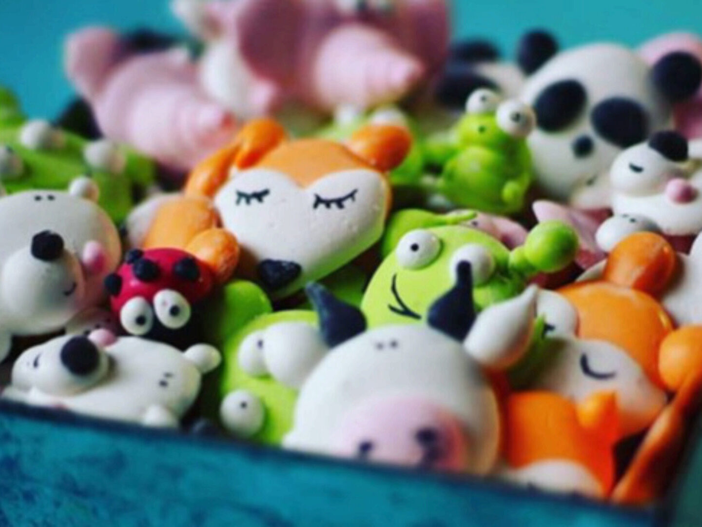 отсадим несколько фигурок поэтапно (медвежат белых и шоколадных, коровок, розовых слонов, вини пухов, божьих коровок и конечно гусеничек )