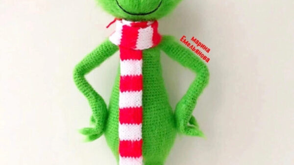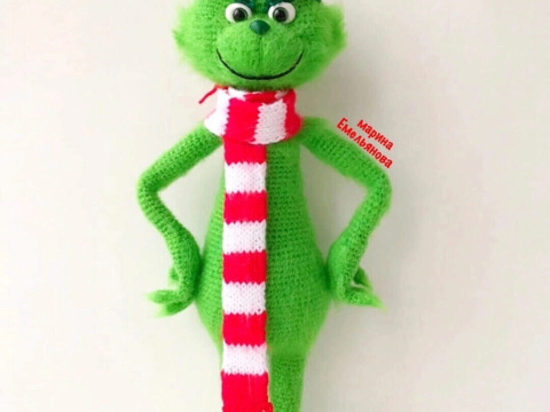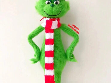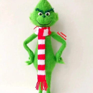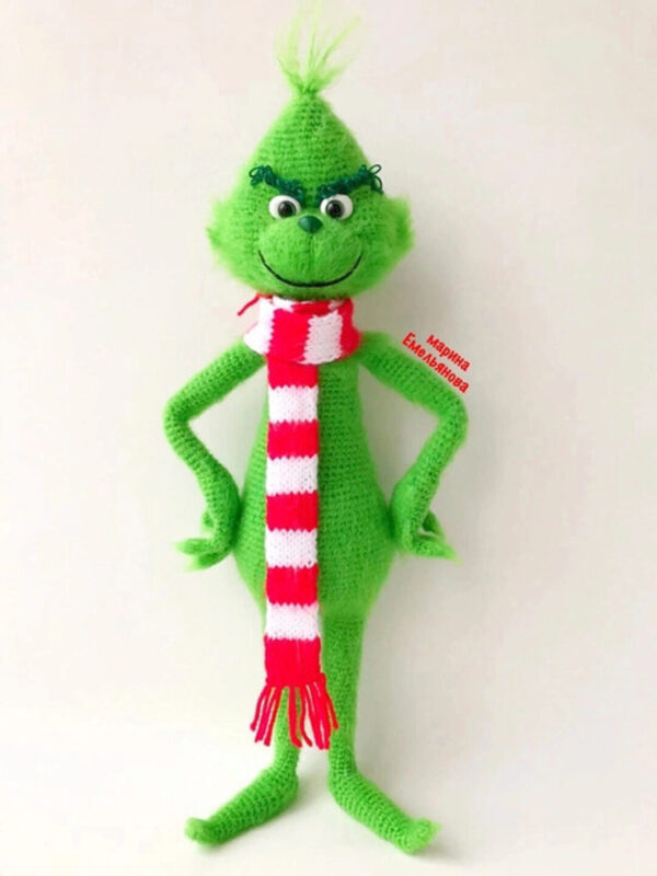 Игрушка имеет проволочный каркас. При вязании из заявленной мною пряжей и средней плотности вязания игрушка получится 33см.