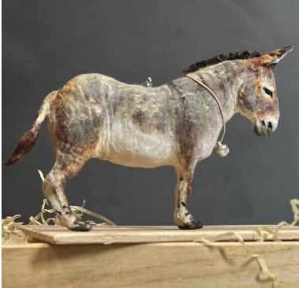 Ослик вяжется из стандартной плюшевой пряжи 100гр/120м. Ноги и руки ввязываются в тело, голова на шплинтовом креплении. Ростом игрушка получается примерно 33-34 см.