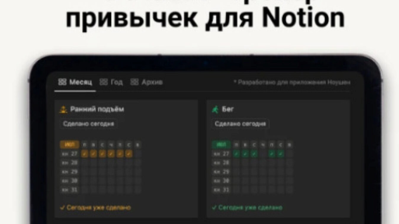 В шаблоне вы найдёте полостью настроенный трекер привычек для Notion. Вам нужно только добавить свои привычки – и он полностью готов к работе.