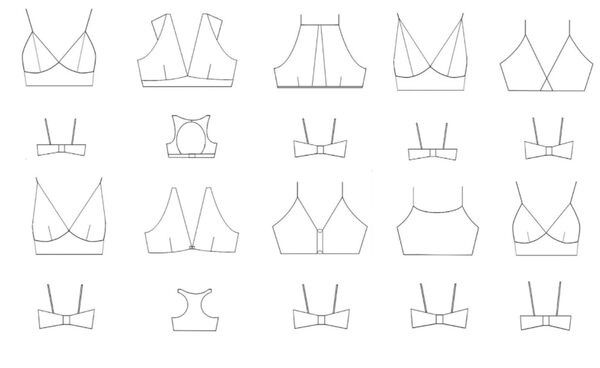 Чашка Ракушка с выходом на бретель и без Чашка Балконет с Т-швом и двумя вариантами верха (с выходом на бретель и без) Чашка Балконет с горизонтальным швом (с выходом на бретель и без) Чашка Балконет с вертикальным швом (с выходом на бретель и без) Чашка с вытачкой (с выходом на бретель и без) Для