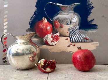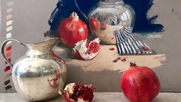 Уже были у нас рыбы и тыквы, теперь фрукт — гранат во всех красе. Натюрморт с посеребрённым кувшином включает в себя много разных фактур, но главное —тут мы изучаем отражения в округлом предмете. Сферическая перспектива здесь правит бал. Заодно разберёмся, как корректно изобразить отражения в металле пастелью.
