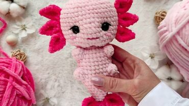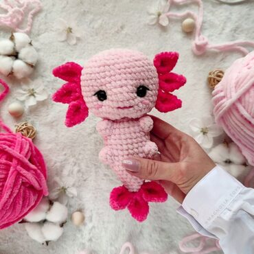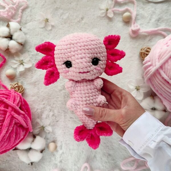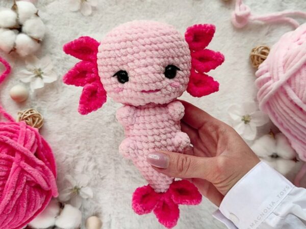 Игрушка цельновязанная. Хвост, лапки, тело, голова - единая деталь, которая вяжется снизу вверх без отрыва нити. Хвост и головные жабры вяжутся на готовой игрушке (дополнительно есть пришивной вариант).