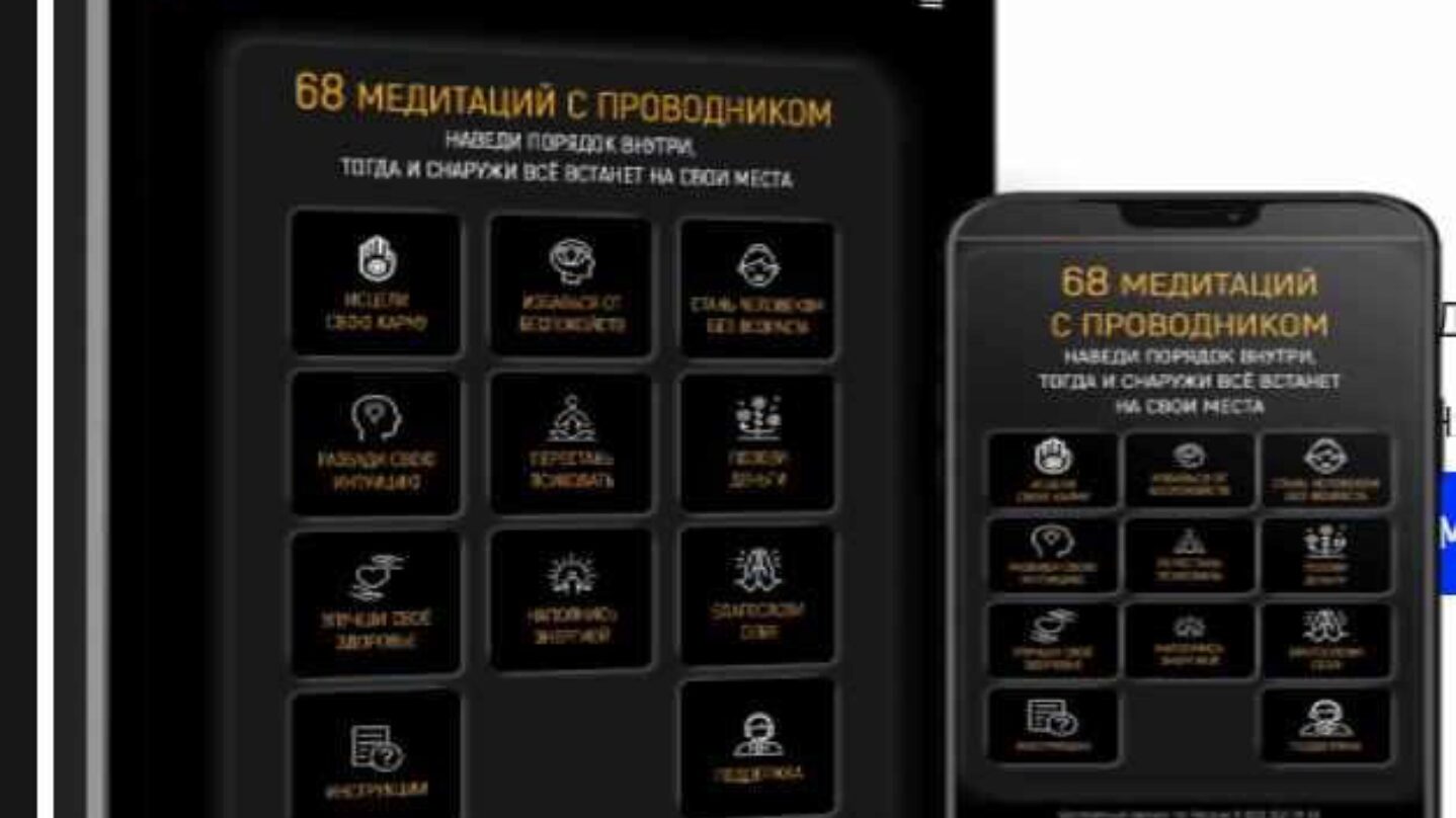 46 ДЗА-ДЗЕН​ Медитация специально для тех, кому мало жить 80 лет.​ Формат: видео​ Продолжительность: 32 мин.​ 47 ПРЕОБРАЖАЮЩАЯ МЕДИТАЦИЯ​ в технике эндорфиновой терапии​ Формат: аудио​ Продолжительность сеанса: 25 мин.​ 48 НЕСТАРЕЮЩЕЕ ТЕЛО​ Квантовая медитация с проводником.​ Формат: аудио​ Продолжительность сеанса: 27 мин.​ 49 СПЕЦИАЛЬНЫЙ ПАРОЛЬ​ Высвобождение энергии.​ Формат: видео​ Продолжительность: 14 мин.​ 50 РАСКРЫВАЮ СВОЕ СОВЕРШЕНСТВО​ Формат: аудио​ Продолжительность: 20 мин.​ ПОЗОВИ ДЕНЬГИ