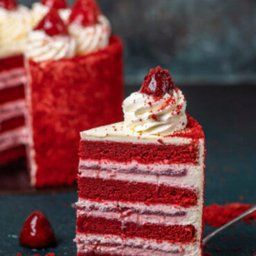 Рецепт и техника бисквитного торта Красный бархат Внутри красного бархата клубничный ганаш, конфитюр и сырный крем.