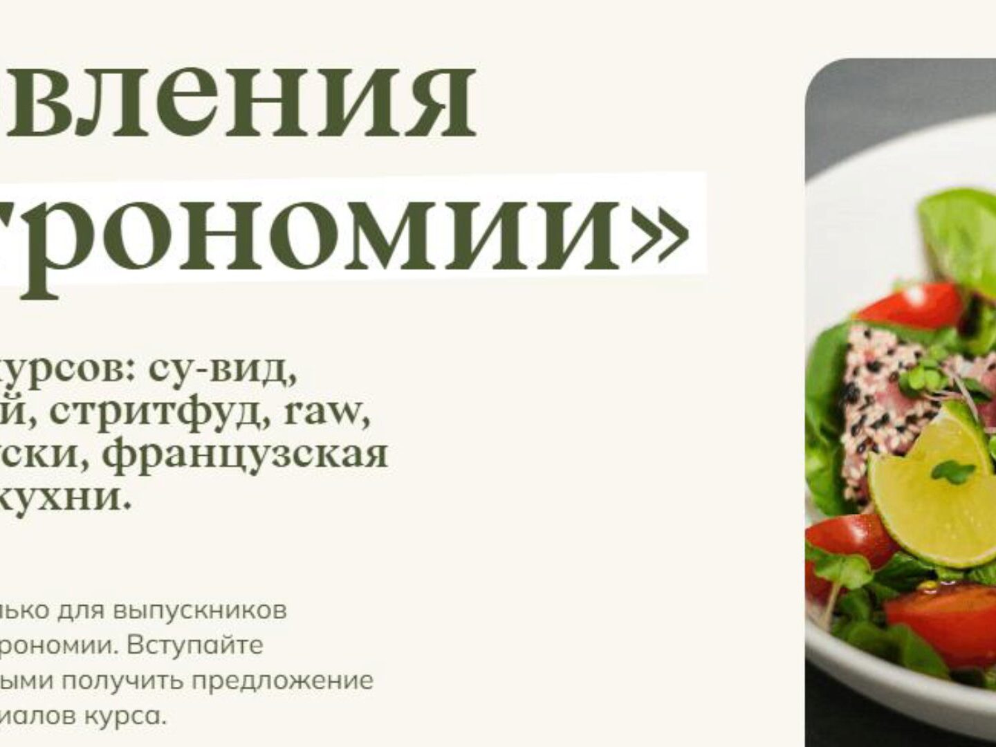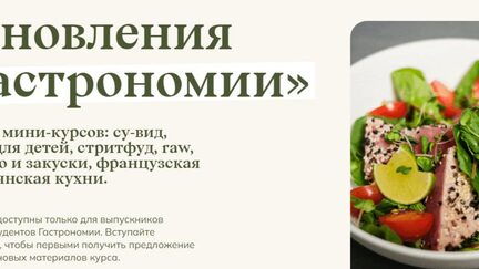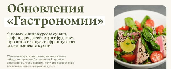 9 новых мини-курсов: Су-вид, Вафли, Детский курс, Итальянский курс, Французский курс, Raw, Стритфуду, Закуски к вину, Винная справка.