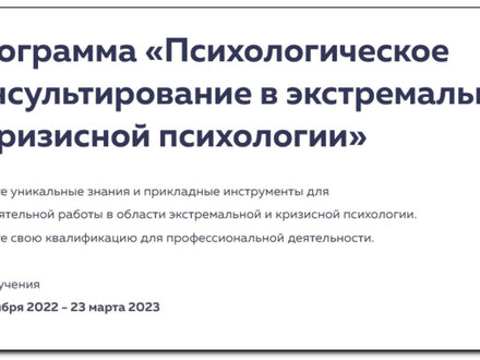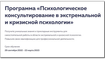 Программа «Психологическое консультирование в экстремальной и кризисной психологии». Для студентов и выпускников программы «Психологическое консультирование по методике PSY2.0», в объеме 1100 академ.часов, стоимость 70 000 Р. Программа сертификата 465 академ.часов Получите уникальные знания и