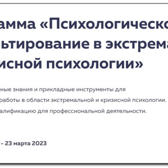 Получите уникальные знания и прикладные инструменты для самостоятельной работы в области экстремальной и кризисной психологии. Повысьте свою квалификацию для профессиональной деятельности.