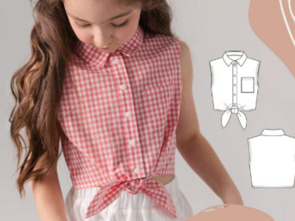 Рубашка умеренного объема, прямого силуэта, без рукавов. С левой стороны переда - накладной карман. По низу переда оформлены завязки. Воротник рубашечный, отложной на отрезной стойке. Застежка - планка центральная на кнопки. Проймы рубашки обработаны бейками. Длина изделия чуть ниже талии.