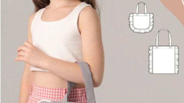 Сумка среднего объёма, прямоугольной формы, на подкладке. По бокам сумка оформлена оборками со сборкой и с закругленными концами. Края оборок обработаны косой бейкой. Сумка имеет две ручки средней длины, что позволяет носить сумку на плече.