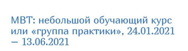 По итогам первого обзорного вебинара мы решили начать учиться МВТ в формате таких же двухчасовых вебинаров, раз в две недели по воскресеньям 18.00-20.00 по МСК, с конца января до середины июня 2021 г., а летом сделать перерыв. Ниже – предварительная программа этого мини-курса, включающая 10 вебинаров. Каждый вебинар будет состоять из теории (мой рассказ о теме), и практики (обсуждение и разбор фрагментов сессий / кейсов / ролевая игра с групповой супервизией). Буду давать домашние задания для желающих – попрактиковаться с клиентами и потом рассказать, как прошло.