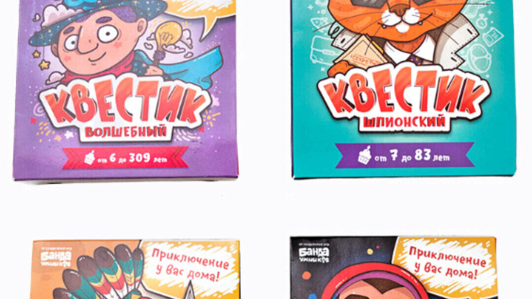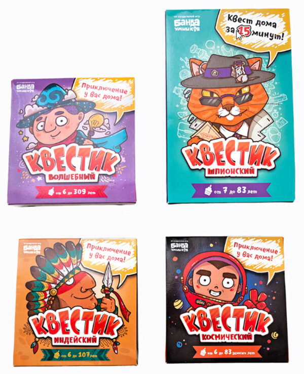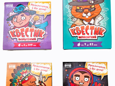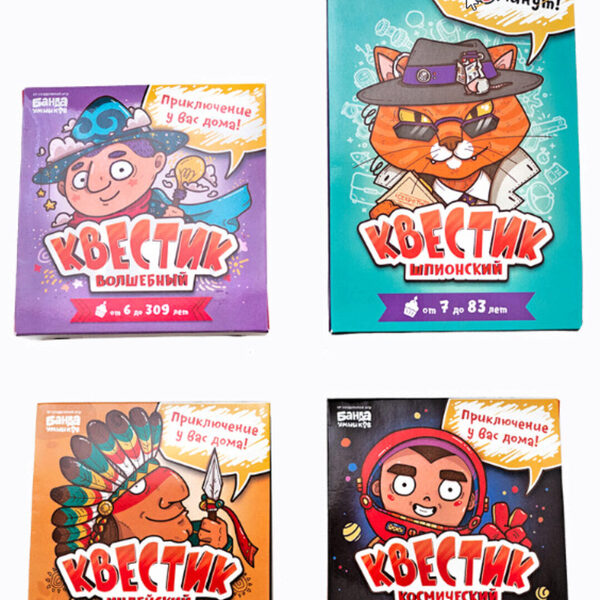 Набор состоит из 4-х Квестиков — «Космического», «Шпионского», «Волшебного» и «Индейского» . Задания в каждом из них понятные и интересные и подходят для детей от 4-6 лет. Взрослые тоже не останутся равнодушны. Именно поэтому на коробках указан рекомендованный возраст до 82, до 83, и даже до 309 лет! С помощью этого набора можно превратить в квест вручение подарка, устроить домашнее приключение и провести интерактивную игру для детей.