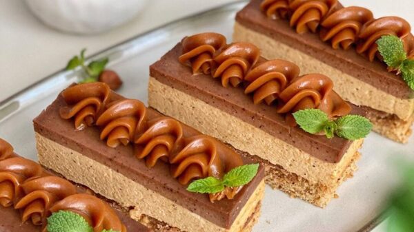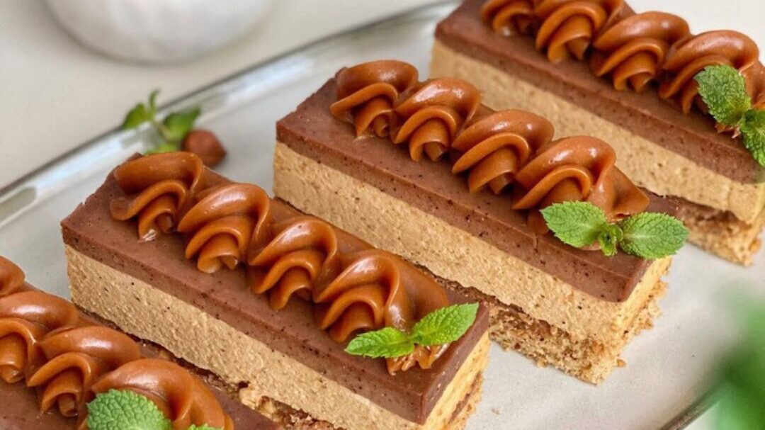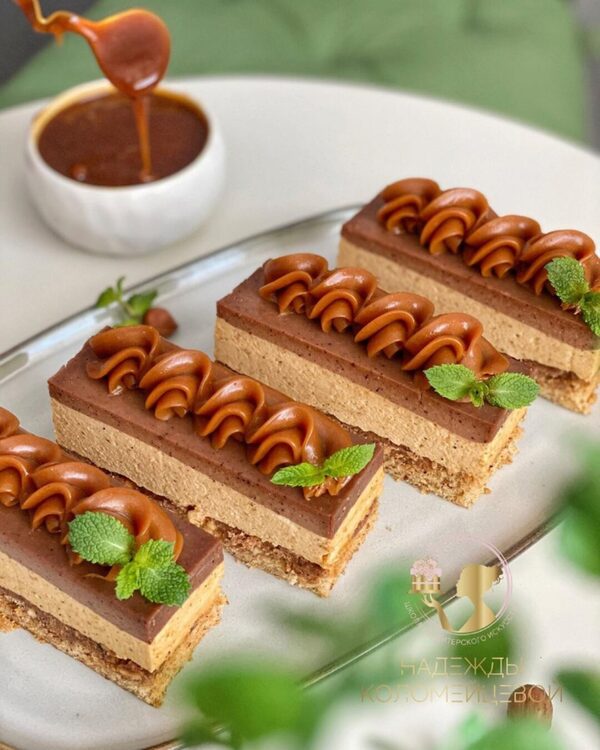 Медовый бисквит с хрустящим слоем пекан-кранча под бархатистым слоем сливочного мусса со шлейфом бельгийского шоколада