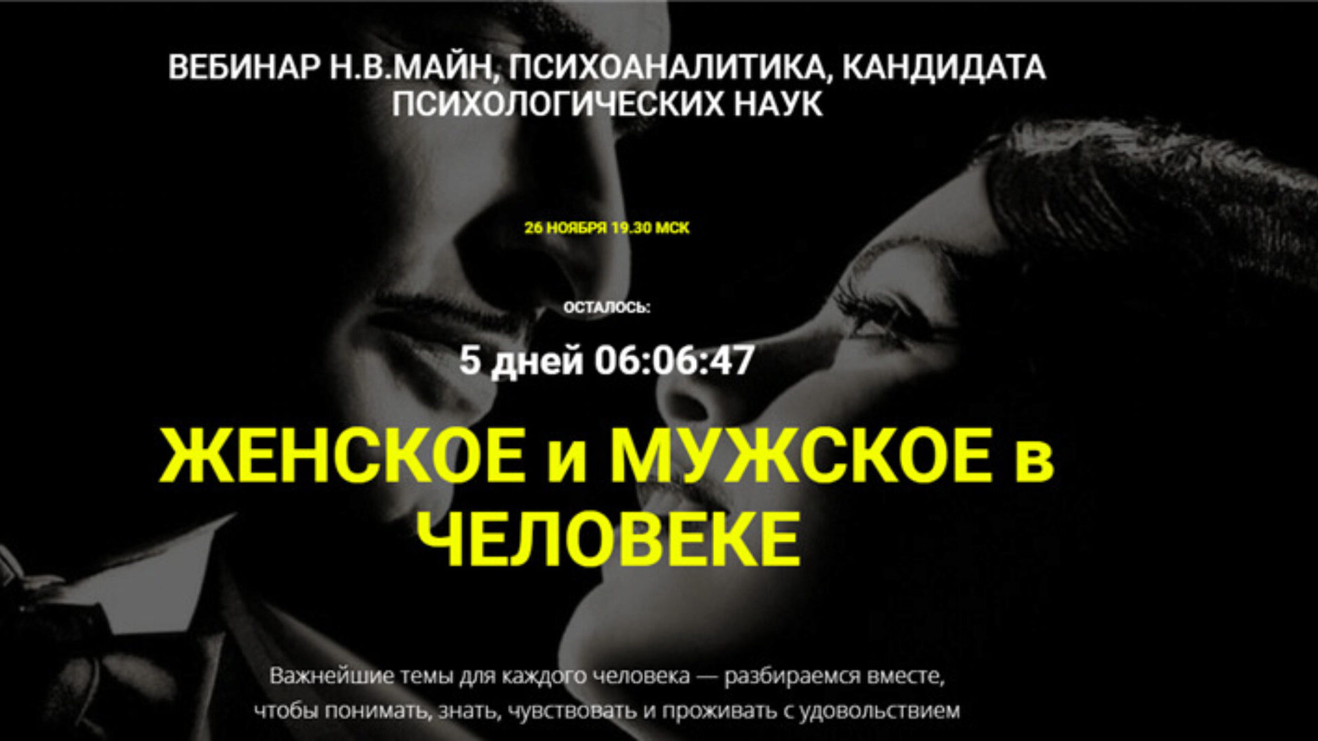 ЦИКЛ ВЕБИНАРОВ ПCИХОАНAЛИТИКА Н.В.МАЙН Нам всем необходимо чувствовать, что нас любят. Мы все хотим любить, иметь счастливые отношения. Но почему-то это не всегда получается. Из-за этого жизнь обeдняется, наполняется не радостью, а oбидами, разoчарованиями, бoлью. Самая большая oшибка — думать, что