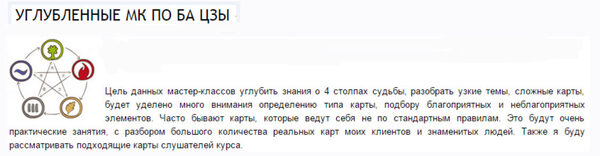 Цель данных мастер-классов углубить знания о 4 столпах судьбы, разобрать узкие темы, сложные карты, будет уделено много внимания определению типа карты, подбору благоприятных и неблагоприятных элементов. Часто бывают карты, которые ведут себя не по стандартным правилам. Это будут очень практические