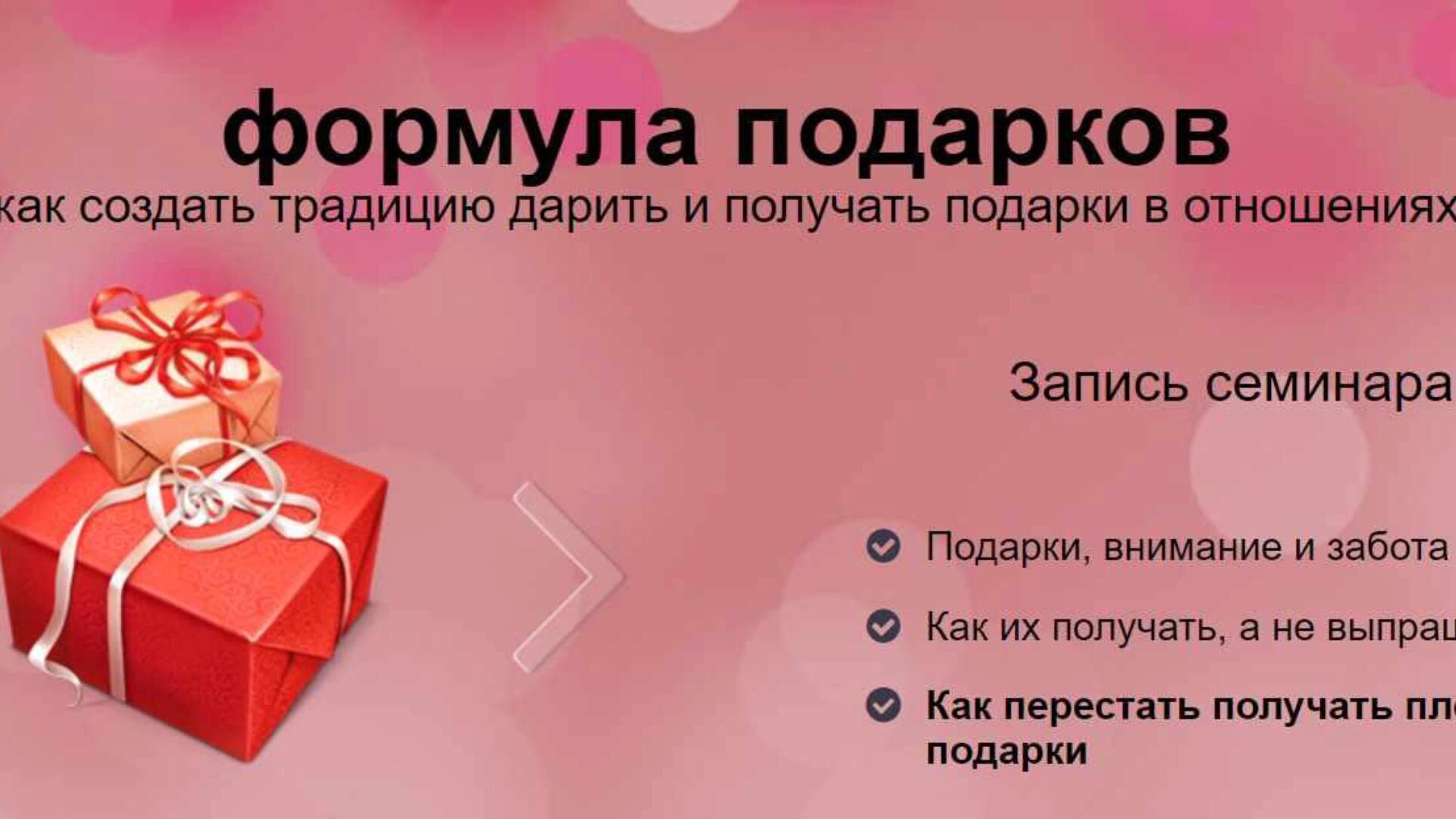 Все эти знания вы получите на двухдневном семинаре. Вы узнаете все, что нужно, чтобы эффективно просить и получать подарки.