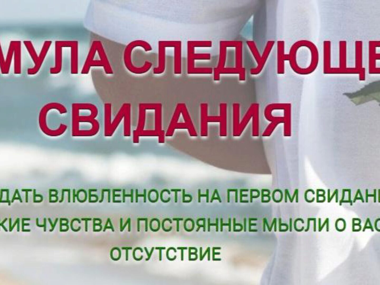 «НИ ДНЯ БЕЗ СВИДАНИЯ» самый полный курс о знакомствах, свиданиях, флирте и пробуждении в себе уверенной, сексуальной женщины. ЧТО МЕШАЕТ ТЕБЕ СОЗДАТЬ СЧАСТЛИВЫЕ ОТНОШЕНИЯ? У тебя нет времени и желания ходить по ресторанам и клубам, чтобы знакомиться с мужчинами Ты до сих пор пор боишься