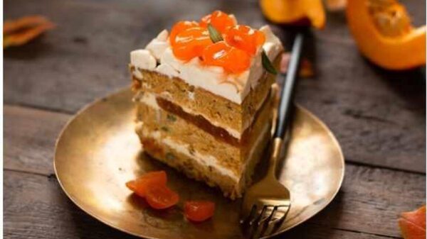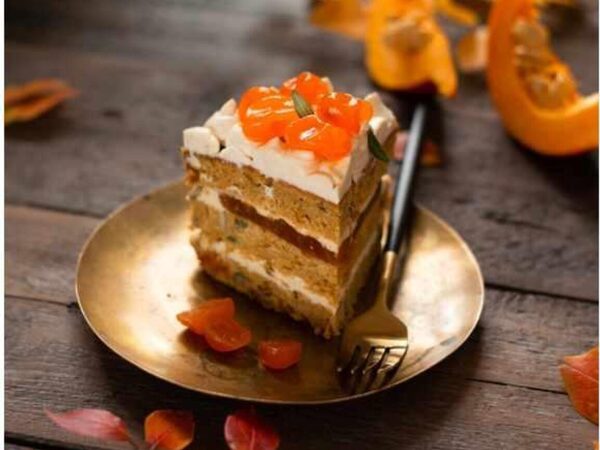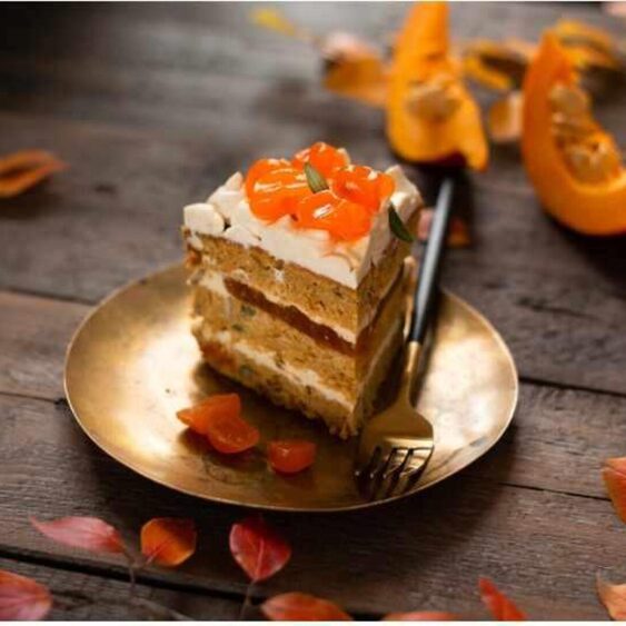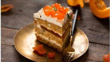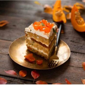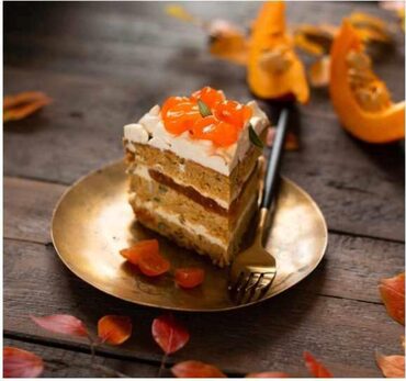 • Влажный тыквенный бисквит с апельсиновыми цукатами, пряностями и семечками тыквы, цитрусовый конфитюр и нежный крем с цедрой.