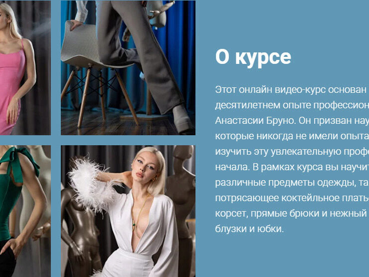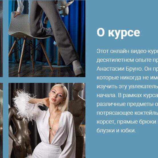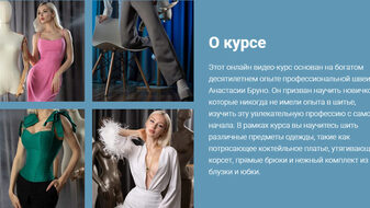 О чем курс Этот онлайн видео-курс основан на богатом десятилетнем опыте профессионального модельера одежды Анастасии Бруно. Он призван научить новичков, которые никогда не имели опыта в шитье, изучить эту увлекательную профессию с самого начала. Пройдя этот курс, Вы нетолько сможете подгонять уже